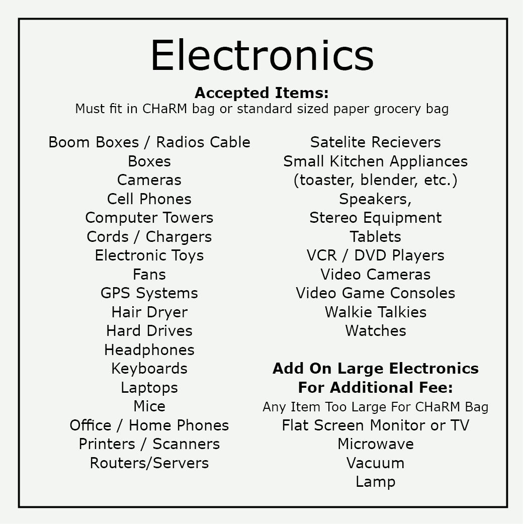 Fill the gap left by traditional recycling with CHaRM. Recycle or reuse countless materials typically destined for the landfill. We partner with trusted organizations to ensure each unwanted item goes to its best possible end use.